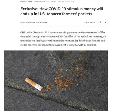 180. 180.0 180.1 J. Huffstutter, T. Polansek. Exclusive: How COVID-19 stimulus money will end up in U.S. tobacco farmers' pockets, REUTERS, 23 September 2020, Accessed October 2020