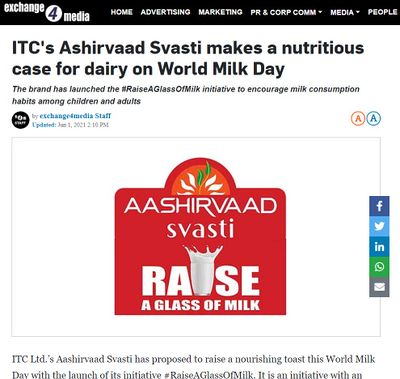- ITC’s dairy product brand Ashirvaad Svasti, introduced a ‘RaiseAGlassOfMilk’ Initiative on World Milk Day claiming that milk is boosting immunity (Image 1).[7] A few days later a new yogurt product was introduced under the same dairy brand.[8]