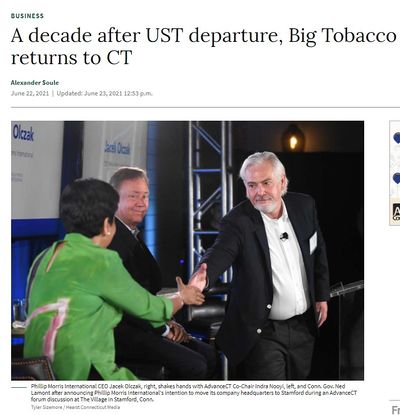- ↑ 56.0 56.1 A Soule. A decade after UST departure, Big Tobacco returns to CT, 23 June 2021, accessed July 2021