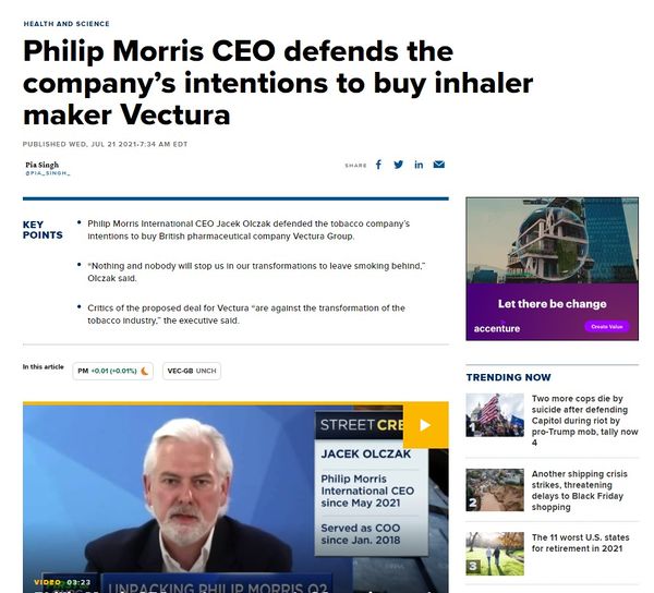 - ↑ 123.0 123.1 P. Singh. Philip Morris CEO defends the company’s intentions to buy inhaler maker Vectura, 21 July 2021, accessed August 2021