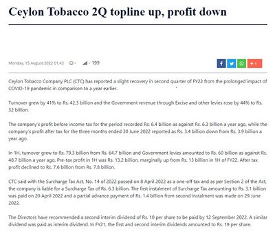 - Ceylon Tobacco Company (CTC) announced a growth of turnover by 41% to Rs. 42.3 billion (approx. USD 120 million) during the second quarter of year 2022. The profit after tax was recorded as Rs. 3.4 billion (approx. USD 9.5 million) during the second quarter. It was reported as 3.9 billion (approx. USD 11 million) for the same period in 2021.[22]