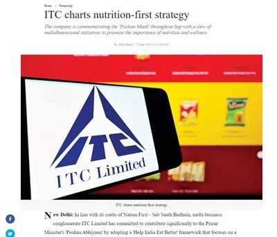 - ITC Limited India got involved in the 'Poshan Abhiyaan' initiative celebrating 'Poshan Maah' (National Nutrition Month) “by adopting a 'Help India Eat Better' framework that focuses on a 'Nutrition-First' approach” as reported in media (Image 2). 'Poshan Abhiyaan' is an initiative of Prime Minister “to lay emphasis on nutritional status of adolescent girls, pregnant women, lactating mothers and children from 0-6 years age”.[6]